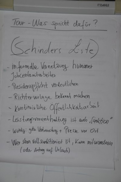 Schließlich diskutierten wir, was für und was gegen eine Deutschlandtour spricht, wie sie bisher angedacht ist. Es kamen sehr viele gute Ideen, Anregungen und Kontakte zur Sprache. Deutlich wurde, dass die Tour noch einen passenden Namen braucht. Wünschenswert wäre eine kontinuierliche Begleitung durch die Presse. Außerdem könnte man der Tour einen offizielleren Charakter geben, wenn Ralph in jeder Stadt auch den Bürgermeister, regionale Politiker und die Geschäftsführer der Jobcetner für kritische Gespräche aufsuchen würde.