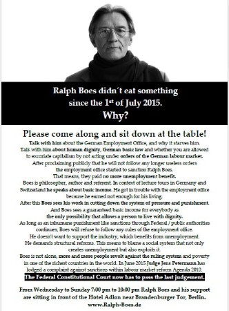 Ralph Boes, a campaigner for unconditional basic income lecturing full time on a voluntary basis, recently made public the grave consequences of the "Hartz-IV" system. Instead of hiding away from the stigma of Hartz-IV sanctioning or choosing humiliating workarounds such as collecting returnable bottles, scrounging, or borrowing from friends, in reaction to a 90% sanctioning he starved publicly for over 3 weeks. Where those sanctioned normally drop off the statistics, disappearing from the politicians´ radar on being banished from the game, Boes wants to expose this inhuman practice as transparently and publicly as he can.