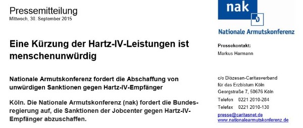Caritas: Hartz-IV-Sanktionen dürfen nicht existenzgefährdend sein, Pressemitteilung vom 1.10.15 Interview mit Michaela Hofmann (Caritas)