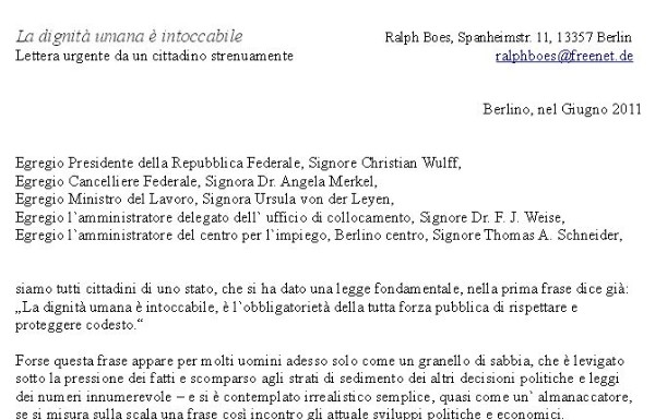 Parla con lui dell' ufficio di collocamento in Germania e perché non ha niente da mangiare. Parla con lui della dignità umana, della legge fondamentale di Germania e si tu hai permesso di sconfessare il capitalismo senza accettare gli istruzioni dell mercato del lavoro.