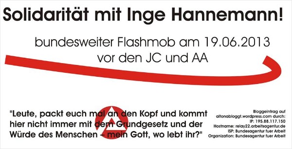 16:15 Inge Hahnemann wurde heute am 22.04.2013 von Ihrer Tätigkeit als Arbeitsvermittlerin "freigestellt" und des Jobcenters verwiesen! Dies kann in einem demokratischen Land nicht toleriert werden! Petition unterschreiben