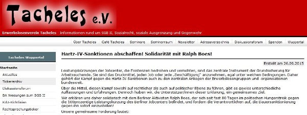 Der Berliner Ralph Boes verweigert seit Anfang November die Nahrungsaufnahme. Er tut dies aus Protest gegen die Kürzung seiner Grundsicherungsleistungen durch das Jobcenter. Ralph Boes hatte im Juni 2011 in einem offenen Brief erklärt: „Ab heute widerstehe ich offen jeder staatlichen Zumutung, ein mir unsinnig erscheinendes Arbeitsangebot anzunehmen oder unsinnige, vom Amt mir auferlegte Regeln zu befolgen.“ Das Jobcenter hat reagiert und seine Hartz-IV-Leistungen um